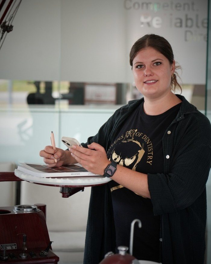 Wenn Amina Deine Praxis betritt, gehen überall die Lichter an – sie ist bekanntermaßen unser dentaler Sonnenschein und bringt so viel Energie, dass die Luft noch Stunden nach ihrem Besuch flimmert.